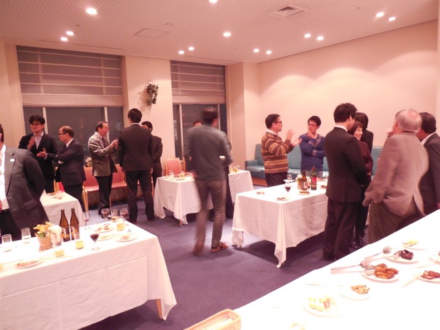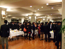 その後、会場を変え、17時30分より開催された懇親会では、来賓・教授陣・在学生も参加し、こちらも楽しく行われました。経営学部学術ゼミナール委員会からも現役学生さんが5名も参加いただきました。各自の出身高校や進路についてのお話があり、委員会において企画検討している発表会について同窓会への支援依頼がありました。また、最後には参加者一同が肩を組み、校歌斉唱をして懇親会は閉会となりました。