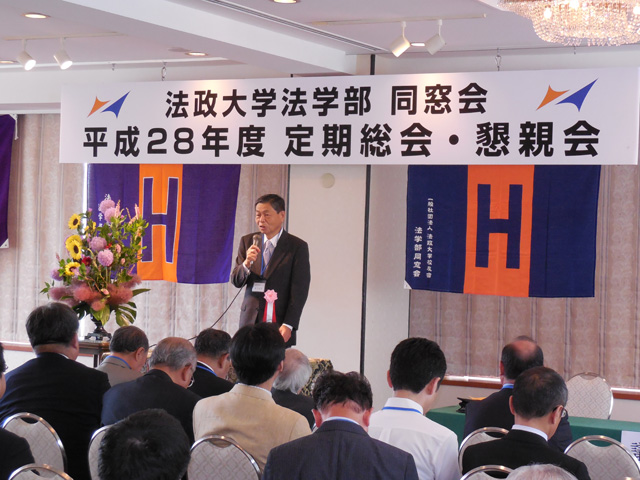 定期総会は、法政大学校友会、他学部同窓会の皆様を来賓としてお招きし、すべての議案が全会一致により承認されました。詳細については、定期総会議事録を別途掲載しておりますのでご参照ください。なお、今回役員選任において承認されました岩井会長から退任のご挨拶、倉林副会長の会長就任のご挨拶をいただきました。