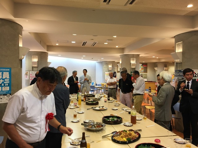 引き続きの懇親会では、外部の居酒屋の個室に場所を移して行われました。20人ほどの参加者が一人ずつそれぞれの学生時代の思い出や近況などをお話しされ、最後に参加者一同が肩を組み、校歌斉唱をして盛会のうちに閉会となりました。