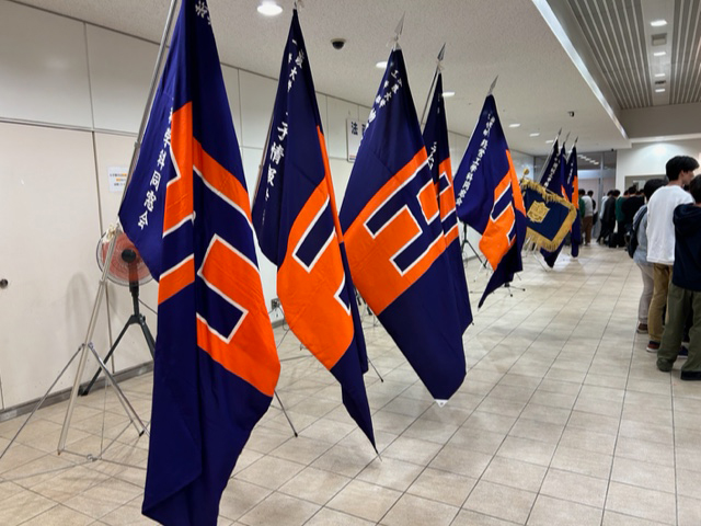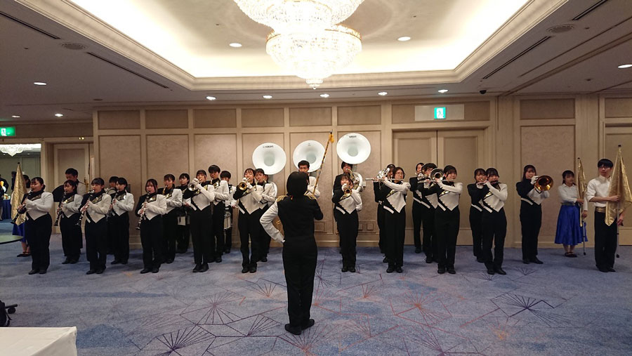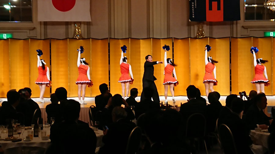 続きましては、恒例の応援団リ—ダー部及びチアリーディング部によるパフォーマンス、そして応援団のリードのもと参加者全員が校歌を高らかに斉唱し、祝賀会を終えました。