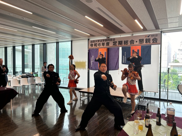 最後は法学部同窓会恒例の応援団・チアリーダーによるパフォーマンスが披露され、そして参加者一同が肩を組み、リーダー部のもと校歌を声高らかに斉唱して閉会となりました。