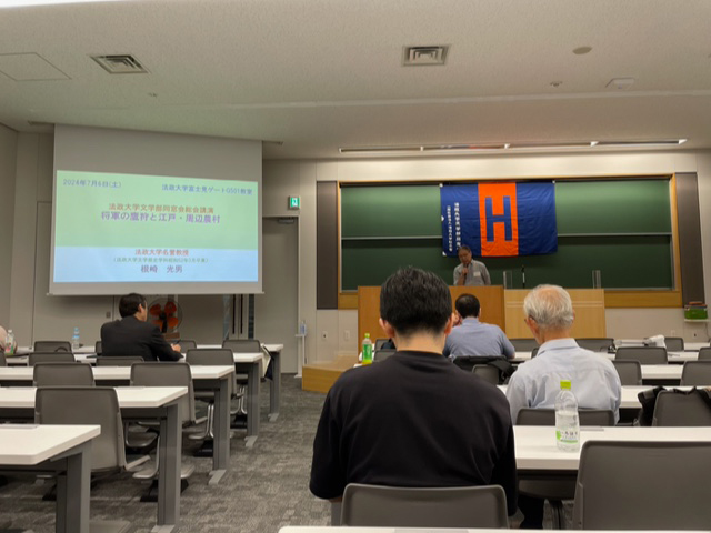 続いての講演会は、根崎光男名誉教授による「将軍の鷹狩と江戸・周辺農村」をテーマとして行われました。鷹狩は、鷹を用いて鳥類や小動物を捕獲する狩猟の一種で、前近代の社会においては特定の権力者だけに許されたもので、権威を象徴するものであったそうです。特に江戸時代においては、鷹狩に関する制度が最も整えられ、幕府の放鷹制度は国家制度として位置づけられ、戦国時代には軍事訓練の役割も担っていたとのことでした。根崎先生のわかりやすい講義から、鷹狩が単なる遊びではなく、国家制度にも発展していったとのお話が印象的でした。