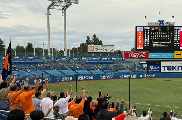 神宮球場の正面入口にて3学部同窓会で待ち合わせをし、内野席のチケットを購入して3塁側入口に向かいました。3塁側内野席に入り、応援の熱気が感じられるように応援団に近いところに陣取りました。学生応援席にはオレンジ色のタオル等を持参した、多数のOB・学生が応援団と共に試合前から熱い応援をしておりました。試合としては経営学部4年篠木投手が先発で試合は始まり、篠木投手は好投しましたが、試合結果は0対2で負けてしまいました。