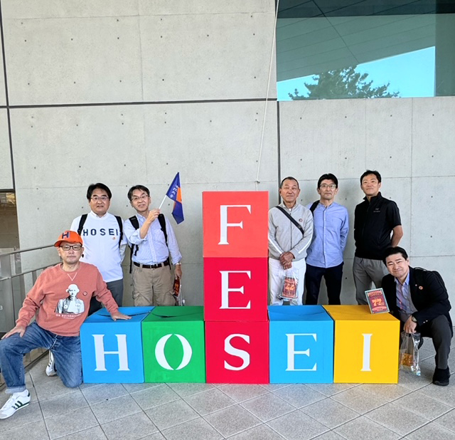 9月7日(土)市ヶ谷キャンパスにて開催の法政フェアに副会長3名にて参加して来ました。当日は、大学に12時に集合し、まずは腹ごしらえ、ボアソナードタワー地下1階のフォレストガーデンにて当日150食限定の教職カツカレーをみんなで食べた後、各イベントに参加しました。パネル展示の「大江宏と55・58年館」、HOSE Iミュージアム動画上映会では7本の動画を約1時間30分かけて視聴しました。動画では、自分も卒業して40年近く経ちますが、初めて知る事実がたくさんあって、さすが法政大学は奥が深いと、今更ですが感じました。その後、キャンパスツアーに参加、グローバル教養学部の学生スタッフによるアメリカインディアナ州での思い出といった待ち時間も飽きさせない楽しいトークの後に、国際文化学部の学生スタッフによりキャンパス内を案内していただきました。ボアソナード博士像の額をさすると頭がよくなるというスタッフの言葉を信じ、博士に失礼は承知で、皆で触らせていただきました。その他、「お子様向けお祭り企画(さかなつり、輪投げ、ぐるぐるUFO)」や「らくがきアートコーナー」があり、お子様連れの若い世代の卒業生も家族みんなで参加されていたり、卒業50年行事式典が開催されており1973年度(昭和48年度)に法政大学を卒業された、たくさんの先輩達にもお会いすることができました。きちっとアンケートにも答えて、エコぴょんマグネットを記念にいただきました。さて、キャンパスを離れ、本日の最後の締めは、飯田橋サクラテラスの元祖餃子舗ミンミンにてビールと餃子・中華で乾杯し、1日を振り返り、皆で楽しい時間を過ごしました。経営学部同窓会では、大学の各種イベントに協賛し、イベントにできるだけ参加しておりますので、ぜひ、ご一緒できればと思います。