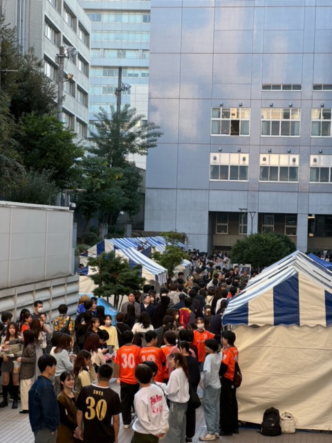 キャンパス内は、とても賑やかで楽しい雰囲気、集合写真を撮り、教室企画を観覧、ニューオレンジのジャズ、イラスト研究会の作品、忘年会でお世話になっている落語研究会、お笑いサークルを観覧してきました。また、校庭の出店もとても繁盛しておりました。われらの友、経営学部学術ゼミナール委員会も今川焼の出店販売をしていましたが、なんと購入までに2時間待ちでした。完成品は、ふぞろいの今川焼ではありましたが、おいしくいただきました。バスケットボール愛好会の売れ残り焼き鳥も、とてもおいしかったですよ。