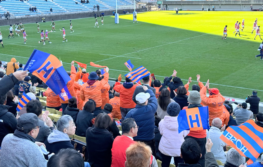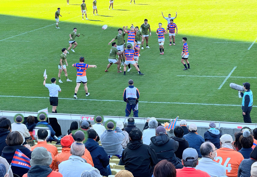 バックスタンドの自由席に陣取り観戦、両校の校歌斉唱の後、11:30キックオフ。周りの法政ラグビーファンからは先制点がポイントになると聞こえて来る中、試合早々、大東文化にトライ&キックと先制点を取られ重苦しい展開の前半、後半は良い展開があったものの、力及ばず法政大学32vs 大東文化大学45でノーサイドとなりました。